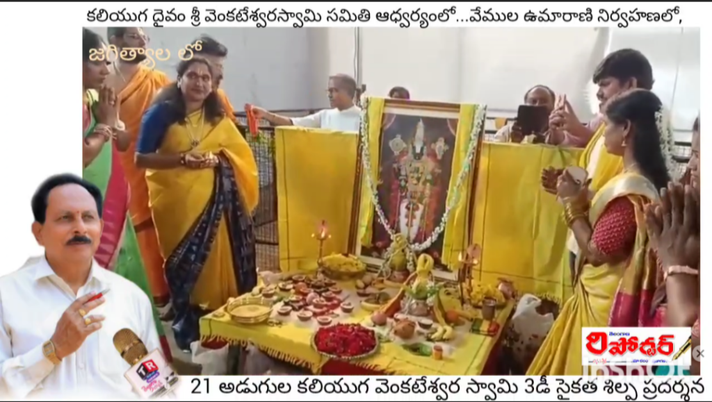 కలియుగ దైవం శ్రీ వెంకటేశ్వరస్వామి సమితి ఆధ్వర్యంలో…వేముల ఉమారాణి నిర్వహణలో, వేద పండితులు, జగిత్యాల శ్రీ వేణుగోపాలస్వామి దేవస్థానం అనువంశిక అర్చకులు నంబి వేణుగోపాలచార్య మంగళాశాసనములతో…తెలంగాణలోనే మొట్టమొదటిసారిగా జగిత్యాల జిల్లా కేంద్రంలో 21 అడుగుల కలియుగ వెంకటేశ్వర స్వామి 3డీ సైకత శిల్ప ప్రదర్శన ప్రారంభమయ్యింది.