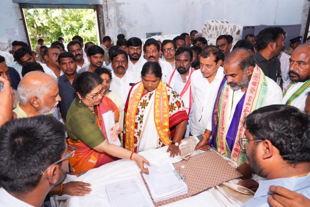 ఇందిరా మహిళా శక్తి పథకంలో భాగంగా నేత కార్మికుల నేసిన చీరలను రాష్ట్ర ప్రభుత్వ విప్ ఆది శ్రీనివాస్,కేకే మహేందర్ రెడ్డి తో కలసి పరిశీలించిన మంత్రి సీతక్క